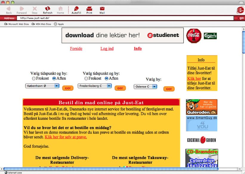 JustEat.dk åbner i Danmark i august 2001, og et år senere havde firmaet behandlet omkring 200 bestillinger om dagen i over 100 forskellige danske postnumre. I begyndelsen af 2004 havde de 500 restauranter på hjemmesiden.