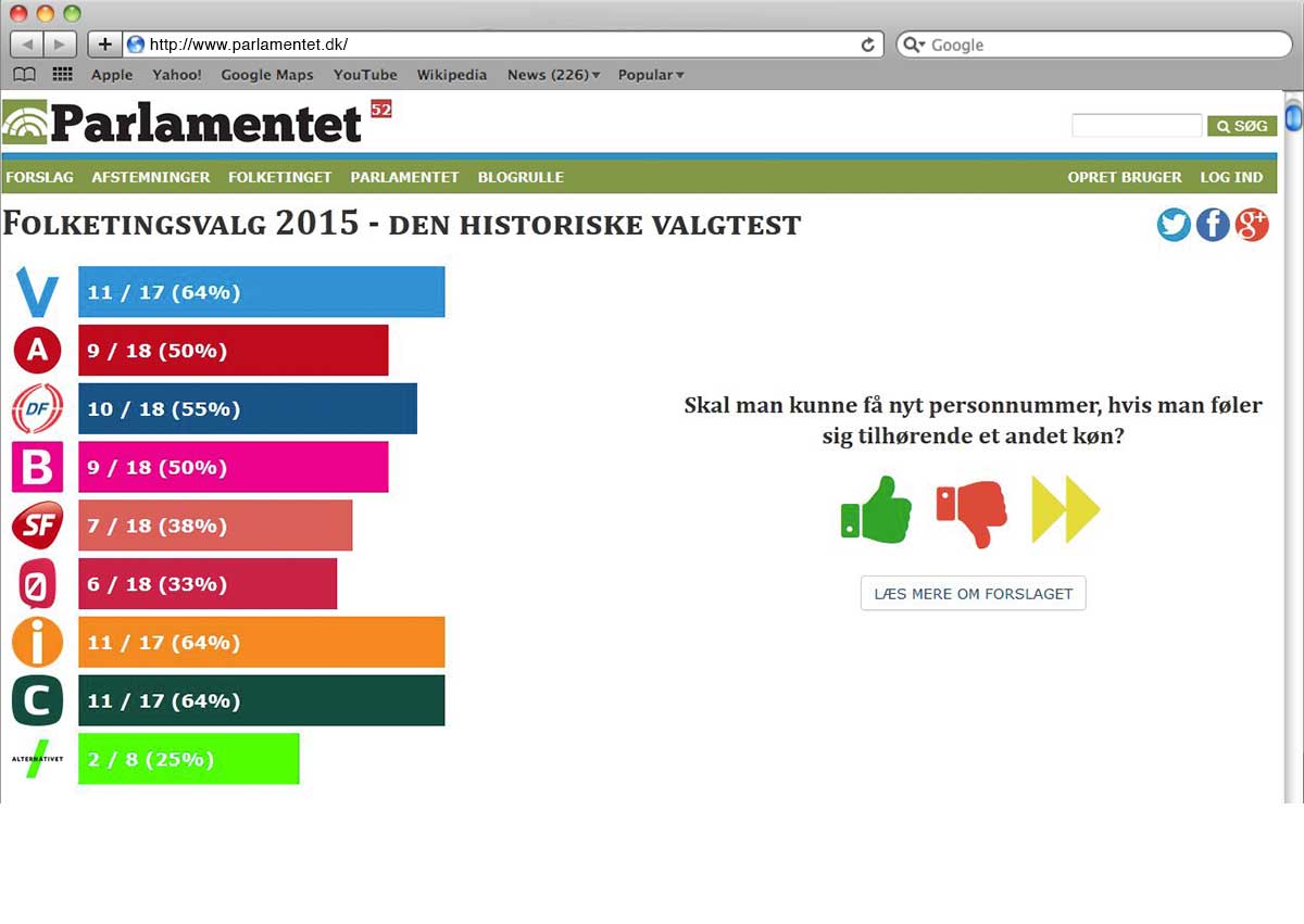 Ved folketingsvalget fik valgtesten et gennembrud på internettet. Hele 60 % af danskerne tog en valgtest for at finde frem til, hvem de skulle stemme på til folketingsvalget d. 18. Juni 2015, hvor Dansk folkeparti blev de helt store vindere. Det siges at 35% af danskerne valgte at følge valgstestens udfald.